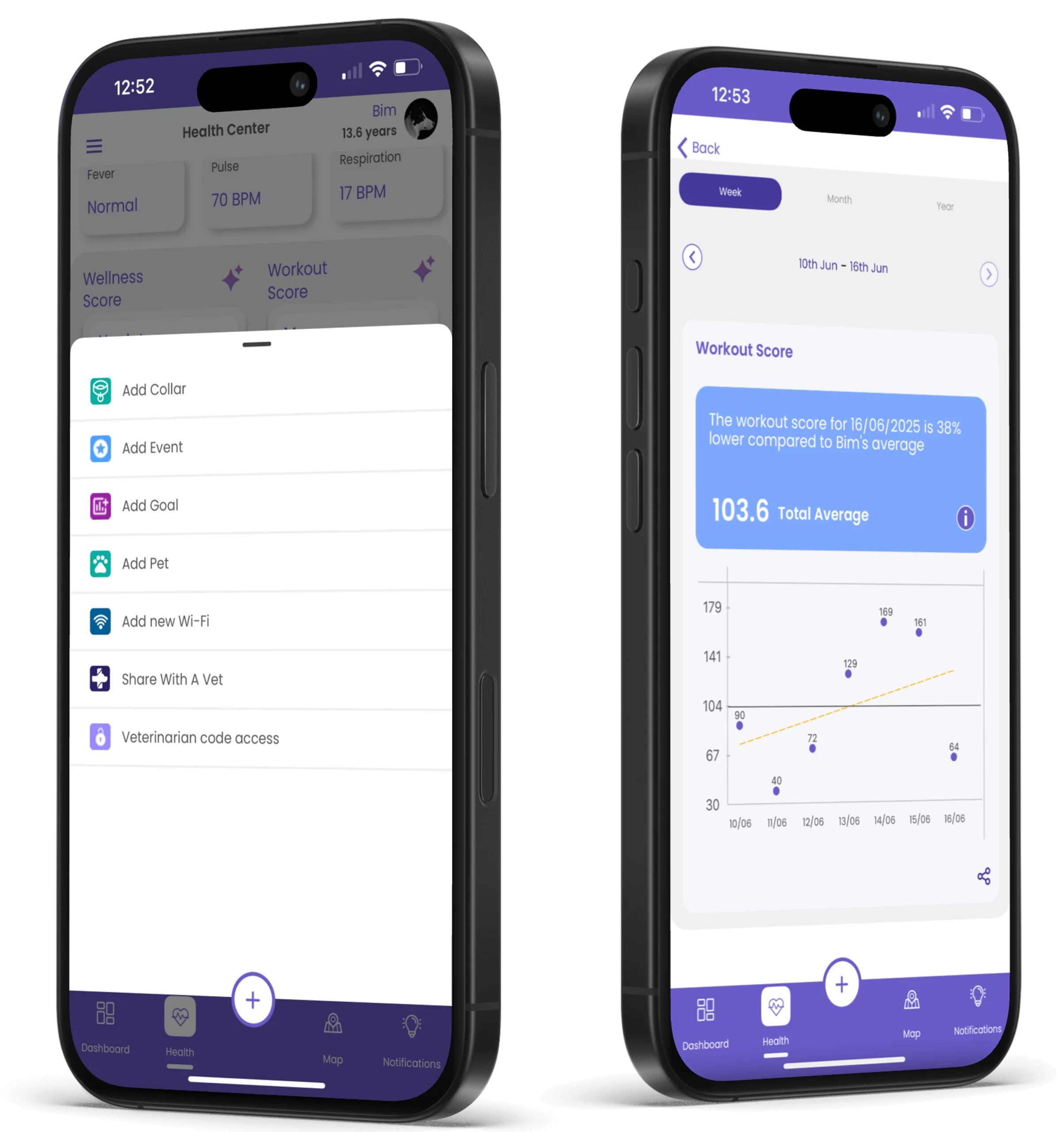 Inside the Animal.Cloud app, click on the + sign and select Share with Vet, add the code you got from the vet to allow him access, and grant permission. The collar’s vital-signs, heart rate, HRV, respiration, temperature, posture, activity, analytics and insights will flow straight to the clinic in near real-time.